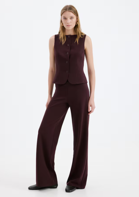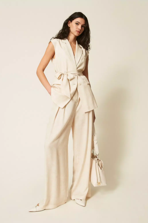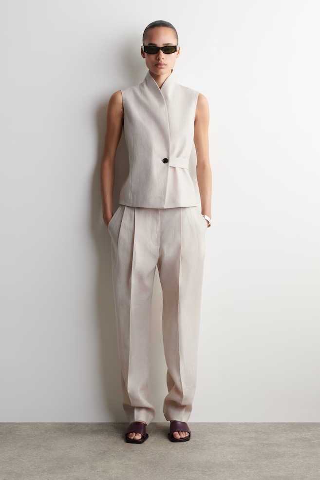 Ne le, da nam je zima postregla s številnimi oblikami brezrokavnikov (pleteninasti, telirani z gumbi …), ta trend ostaja zelo močan tudi za pomlad in poletje. Gre za strukturirane zgornje dele na gumbe, ki so lahko bodisi del trodelnega kostima (torej hlače + suknjič + telovnik) bodisi del kompleta s hlačami ali krilom. Telirani zgornji deli brez rokavov in z gumbi so zelo primerni za poletno službeno oblačenje, saj so mnogo formalnejši od ostalih poletnih topov brez rokavov. Lahko jih kombiniramo s hlačami ali krili, lahko v enakem ali drugačnem materialu.