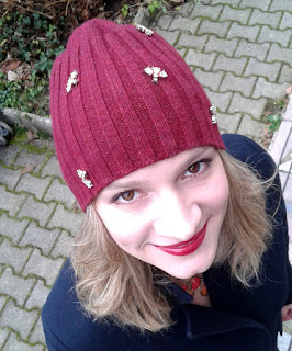 Jaz sem s škarjami razrezala najlepše koščke stare ogrlice (ki je bila nekoč sestrina, a ji jo je moja hčerkica pokvarila in se je ni dalo več usposobiti ;)) in se lotila sicer zelo priljubljene bordo kape, ki jo veliko nosim. Ker pa sem sraka in so mi svetleče stvari všeč, sem si kapo tako še dodatno polepšala in jo bom še raje nosila.