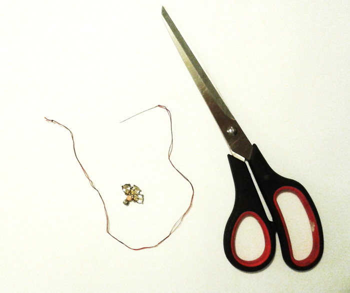 Korak 2: potrebuješ sukanec v enakem odtenku kot je kapa, šivanko, škarje in seveda kristalčke, broške ali druge okraske